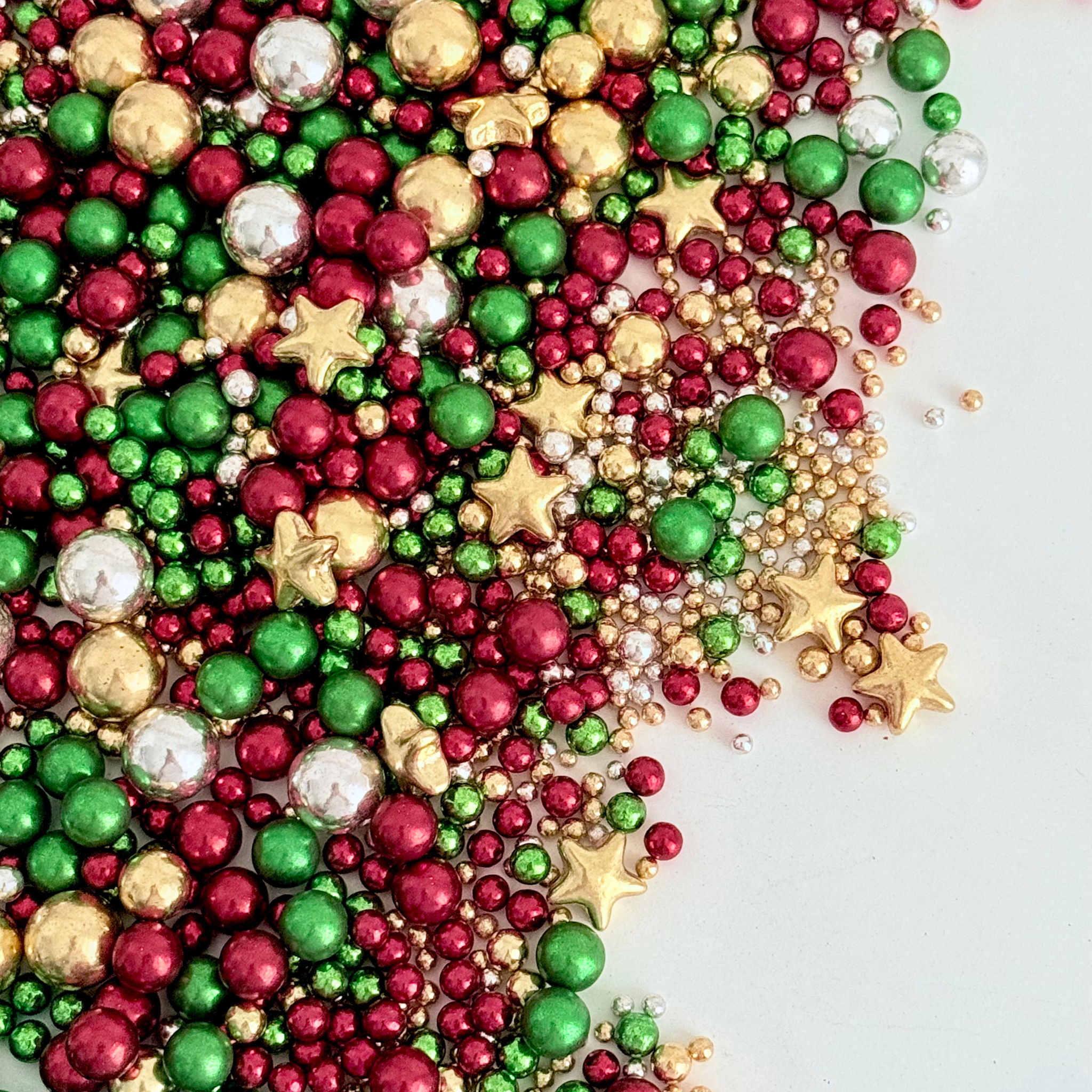 Celebrate the festive season with our vibrant Christmas Sprinkles Mix! Featuring a dazzling combination of red, green, gold, and silver pearls in various sizes, this mix adds the perfect sparkle to your holiday cakes, cupcakes, and treats. Halal and vegan, they are not just beautiful - they are safe for everyone to enjoy!
